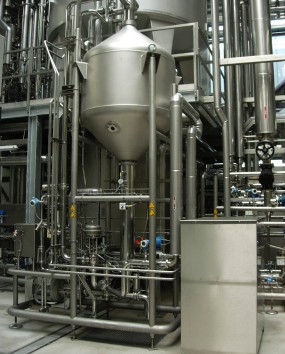 In order to avoid the disadvantages of the annular-gap, diffuser and tangential nozzles previously used in most cases, Krones has developed a swirl inlet, designed so as to ensure that the product is gently passed along the tank's walls, as soon as it comes into contact with the deaeration tank's specially designed cover. Thanks to the discharge velocity and the adhesive force involved, the juice thus forms a very thin film over the tank's walls.