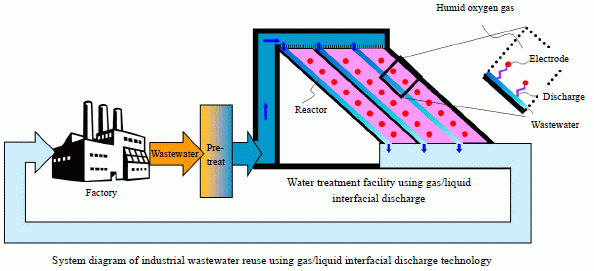The system's reactor uses several inclined plate electrodes in humid oxygen over which the wastewater flows. A pulsed corona discharge generated at the interface of the humid oxygen gas and wastewater produces OH radicals, a strong oxidant with an oxidation potential of 2.85 eV, compared to 2.07 eV for ozone. Due to the OH radical's high reactivity, persistent substances such as surfactants or dioxane decompose into carbon dioxide, water molecules and other inorganic compounds.