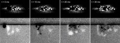 With a high-speed camera, the process surface of the laser welding process for aluminium was recorded (upper image sequence). Laser output was 5kW with a feed rate of 5 m/min and a focus diameter of 560µm. The lower images show the synchronous x-ray video of the process surface. Tungsten particles were used as tracers. Courtesy: LASYS
