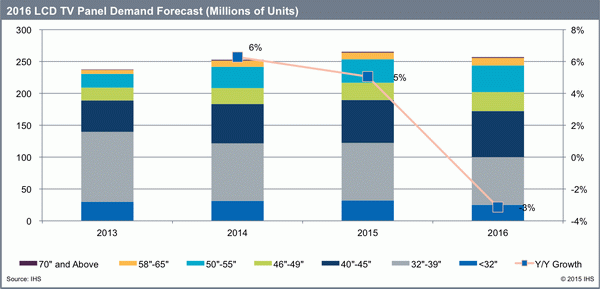"TV panel inventory adjustments will continue into the first half of 2016, because more manufacturing capacity will be coming online, especially in China," said David Hsieh, senior display director for IHS. "Global consumption is stagnant and the replacement cycle is slow, which will not support strong growth in the coming year."