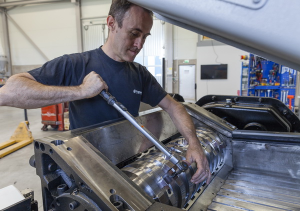 The tilting hopper opens with an electrically operated jack, while the screen and granule bin can be handled by a single operator. The unique screen cradle design does not require the removal of bolts in order to remove the screen, and the granule bin slides out easily. The same tool is used to unlock the front door and to rotate the rotor. As an option, a light can be fitted to provide extra illumination.