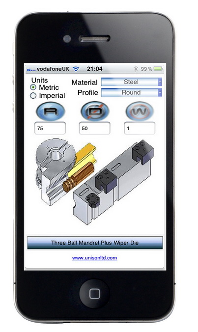 Scarborough, UK, July 13, 2011 --- A unique calculator for evaluating bending machine tooling is now available for the Apple iPhone. Developed by tube bending machinery specialist Unison, the calculator enables users to quickly and easily determine the tooling needed for performing a particular bending task on any type or make of tube bender. Simply by entering the bend radius, tube diameter and wall thickness - in metric or imperial units - users can instantly gain a clear visual representation of the type of mandrel and wiper die they will need to employ to achieve a perfect bend. The calculator helps demystify the 'black art' of tube bending, and is likely to appeal to anyone faced with evaluating tooling requirements for production or costing purposes.