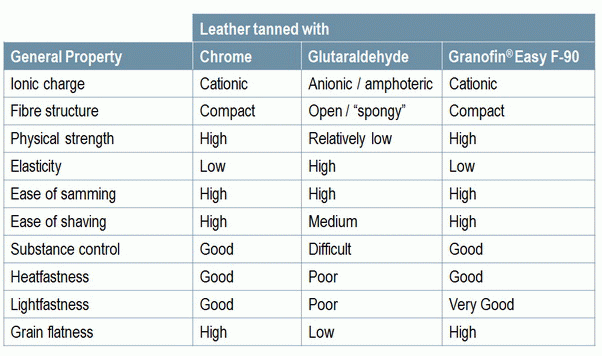 A summary of the characteristics of leather tanned with Granofin® Easy F-90 is given in the attached Table, which clearly demonstrates that the new, simplified tanning system produces leathers that can match those produced by chrome tanning.