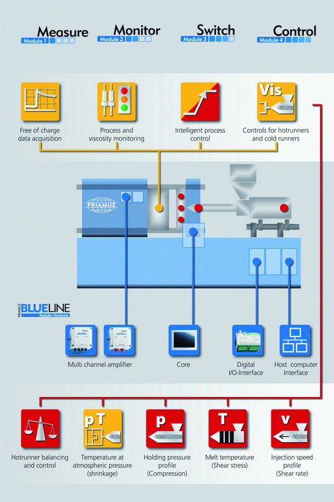 With its modular platform, the PRIAMUS FILLCONTROL system can be configured by the user to meet specific application needs. Combined with the new digital PRIAMUS BlueLine devices, basic process monitoring through complete process control can be accomplished with ease. The PRIAMUS control package also includes automatic balancing and control for hot runner molds.