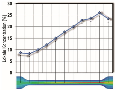 Figure 1 - Visualization in SIGMASOFT® of the particle concentration over the length of an injection molded micro-specimen for tensile testing.