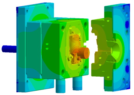 With the CAD files loaded and automatic mesh generated, the process is defined to incorporate the actual production process values. Subsequently, a single-cycle thermal analysis of the part and mold is conducted to identify hot and cold spots in the part and mold. Part orientation and cooling line location and temperature are all optimized to minimize the cycle time while reducing thermal gradients which negatively influence part distortion. Consequently, it is possible to evaluate the efficiency of the tempering system based on the energy consumption. Furthermore it is possible to predict the correct ejection forces and the influence of post-molding tempering processes, such as painting, galvanization, or annealing on the stress distribution on the part and the resulting dimensional stability. Removal of part material during machining operations and the redistribution of stresses can also be considered.