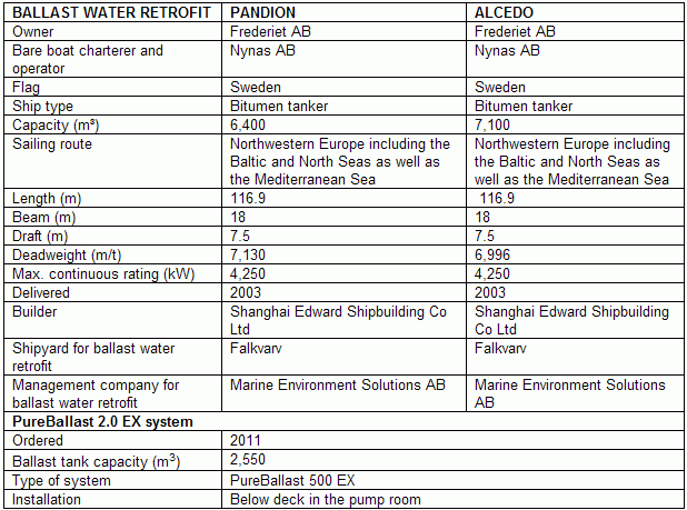 Once Nynas cast its vote of confidence for the Alfa Laval PureBallast system for the newbuildings it charters, the company saw no reason to change course to retrofit older vessels. In July 2011, upon recommendations from Nynas, shipowner Frederiet placed an order for two PureBallast 500 EX, generation 2.0, the second generation of the chemical-free PureBallast systems, for its Alcedo and Pandion bitumen tankers.
