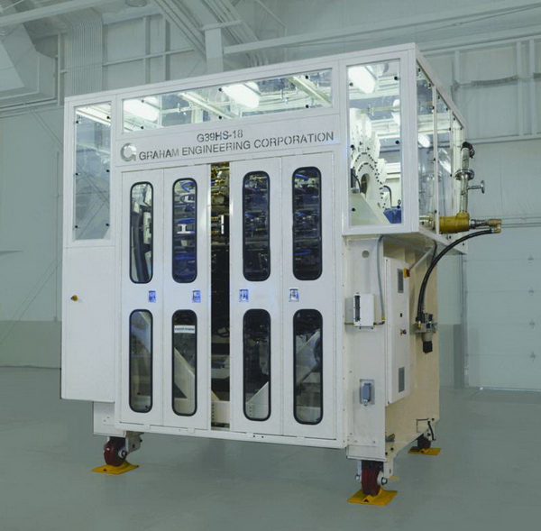 YORK, PA--(Marketwire - Jul 16, 2012) - Graham Engineering Corporation (GEC), the York, PA, USA-based manufacturer of extrusion blow molding equipment, has commercialized the first in its series of "next generation" rotary wheel machines. Christened the "HS Series," this new line of wheel machines with two-ton clamping stations is designed to process lightweight bottles, such as dairy, juice or yogurt containers, at speeds of up to 12 RPM.