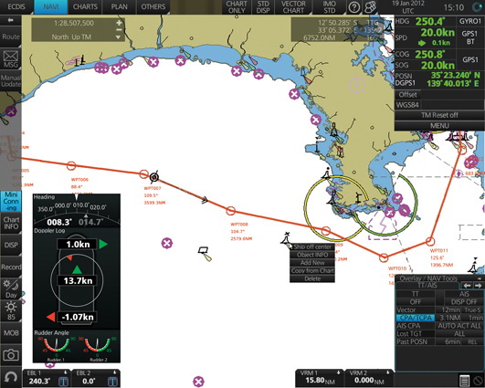 The new ECDIS FMD-3200 and FMD-3300 provide the operator with quick access to the tasks and functions to be performed in the midst of vessel operation. The new ECDIS employs intelligently arranged Graphic User Interface elements: Status Bar and InstantAccess Bar that deliver task-based operation scheme to give the operator direct access to necessary operational procedure. The Status Bar at the top of the screen provides operating status, including modes of operation and presentation. The InstantAccess Bar on the left edge of the screen provides quick access to functions available in each of the ECDIS operating modes. The contents of the InstantAccess Bar change according to the operating modes selected on the Status Bar. This combination of the Status Bar and InstantAccess Bar covers virtually the entire operation, hence providing easy and quick access to the tasks to be performed. Subsequently, their need for digging into intricate menu tree to reach the necessary tasks has become a thing of the past. This would streamline the navigation monitoring procedure, reducing the risk of confusion and erroneous operation as well as to enhance situation awareness. Also, the new ECDIS utilises cutting edge chart-drawing engine that delivers instantaneous chart redraw with the seamless zooming and panning, hence making the ECDIS operation stress-free. Moreover, its operation philosophy is based upon the same logic as the control scheme of a mouse that people are accustomed to in using a PC, and all operations can be controlled with the use of trackball of the control unit by means of left-clicking, right-clicking and using a thumbwheel. Also, full QWERTY style keyboard is available in the ECDIS control unit for easy route, event and waypoint naming.