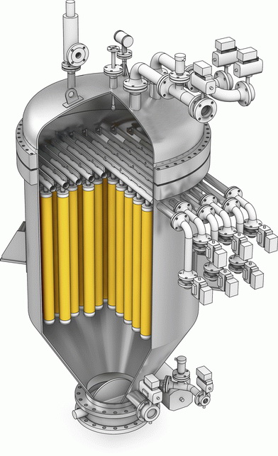 The BHS candle filter is an automatic, batch-operated filter bed with vertically arranged filter elements. The suspension is fed into the pressure vessel and continuously pumped. The filter cake is formed on the outside of each filter candle. The filtrate is discharged from the inside of the candles through immersion pipes. After filtration, the filter cake can be washed, reslurried or dried. Finally, the cake is lifted by a blast of compressed air and discharged.