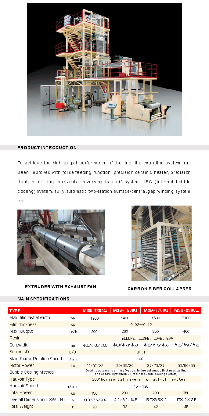 To achieve the high output performance of the line, the extruding system has been improved with force-feeding function, precision ceramic heater, precision dual-lip air ring, horizontal reversing haul-off system, IBC(Inner Bubble Cooling) System, fully automatic two-station surface/central/gap winding system etc.