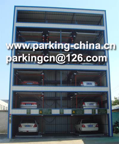 The equipment is designed with 6 levels with multi-rows and each level is designed with a space as an exchanging space. All spaces can be lifted automatically except the spaces in the first level and all the spaces can slide automatically except the spaces in the top level. When a car needs to park or release, all spaces under this car space will slide to the empty space and forms a lifting channel under this space. In this case, the space will go up and down freely. When it reaches the ground, the car will go out and in easily.