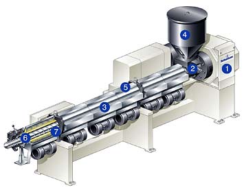 The extruder barrels are manufactured from extremely hard-wearing, corrosion-resistant bimetallic materials. Screw design and screw geometry are developed and matched to the specific raw material and product requirements. The manufacture of screws and barrels is undertaken on ultra-modern computer-controlled central turning and milling units. An extensive quality assurance program ensures screws and barrels are supplied to a consistent high quality.
