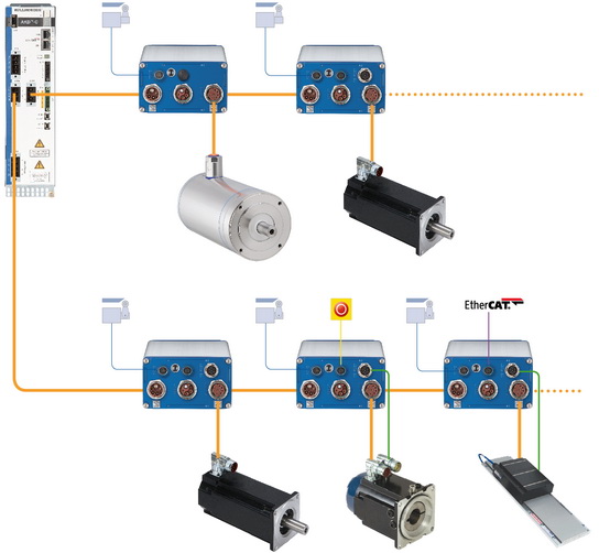 The decentralized drive system consists of a central power supply and robust IP67 rated servo drives, which are placed nearby the motor. The system offers everything that is needed for the next generation of machine design - and removes everything that hinders the simplicity. Power supply as well as safety and fieldbus communication are combined in one single hybrid cable of only 11mm diameter. On the motor side there is also only one cable needed for power, brake control and feedback. Altogether leads to cable savings in the machine of more than 80%.