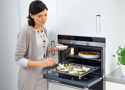 In developing it, the focus was not only on convenience and safety but also on straightforward use. The locking point can be felt, and a gentle clicking noise signalises that the runner has securely locked into place. Involving hardly any force at all, it is released in response to a light push. The Perfect Stop function is fully integrated into the runner and hidden from view inside the oven.