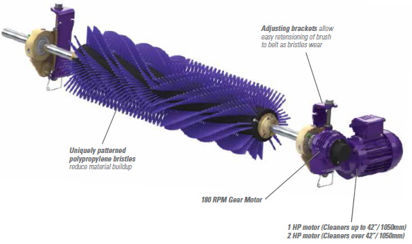 Chevron, cleated and raised-rib belts present a special problem for efficient cleaning. The Motorized Brush Cleaner is an ideal option for cleaning these belts. It also performs well as the second or third cleaner in a system with worn or pitted belts, as the bristles effectively dislodge trapped material.