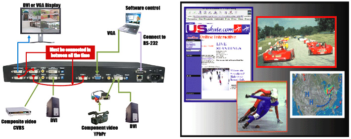 The embedded scaler converts signals from input sources to match the native resolution of monitors, flat panel displays, projectors as well as user-selectable output settings up to WUXGA (1920x1200). Dual outputs are provided in both analog (VGA) and digital (DVI) format, one is connected to remote display and the other is connected to on-site display for real time monitoring.
