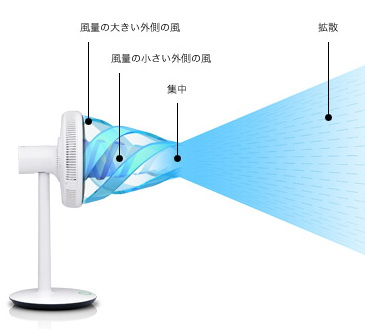 Green fan Barumyuda proprietary technology, the technology to change the direction and movement of wind speed by sending the wind from the fan of one of two types. Wings of the double layer structure, the wind a little, from the outside and sends out a lot of wind from the inside.